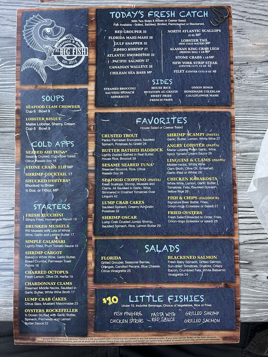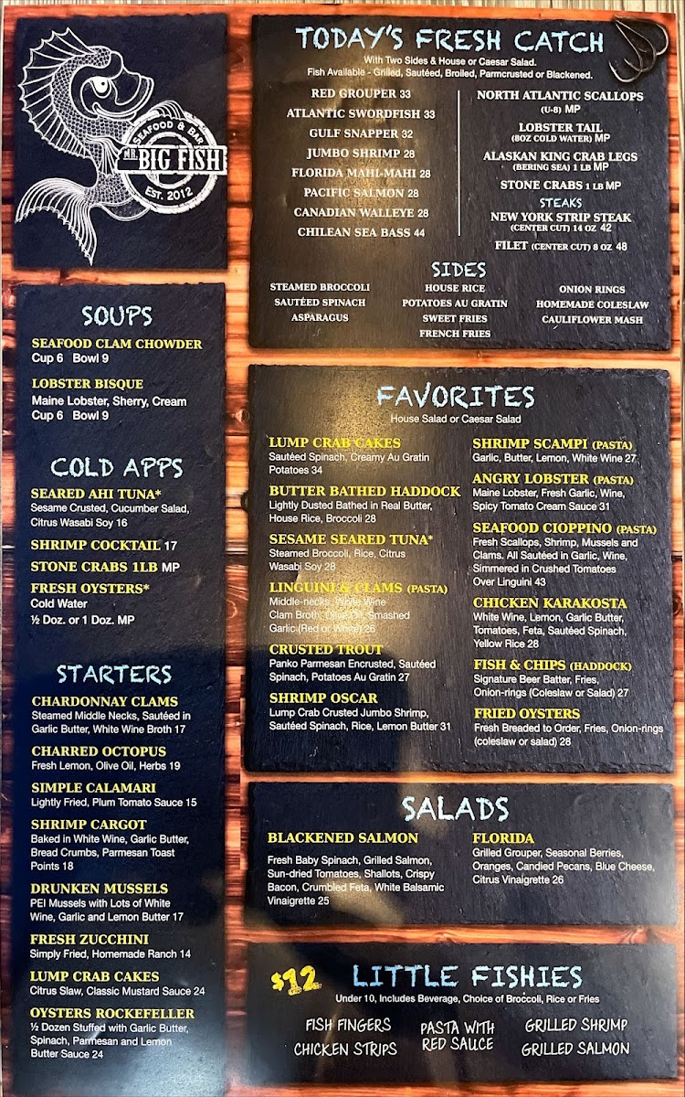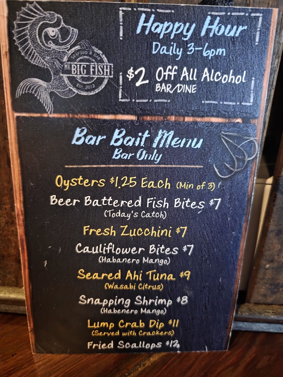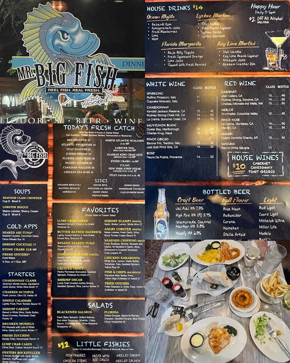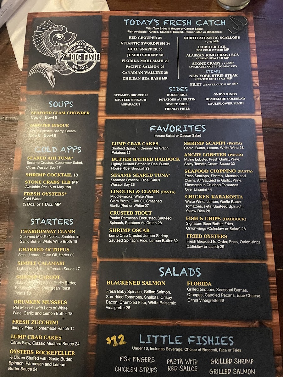 The menu at Mr.Big Fish features a variety of seafood options alongside salads, appetizers, desserts, and a selection of beverages. It is designed to accommodate both casual dining experiences and more substantial meals.