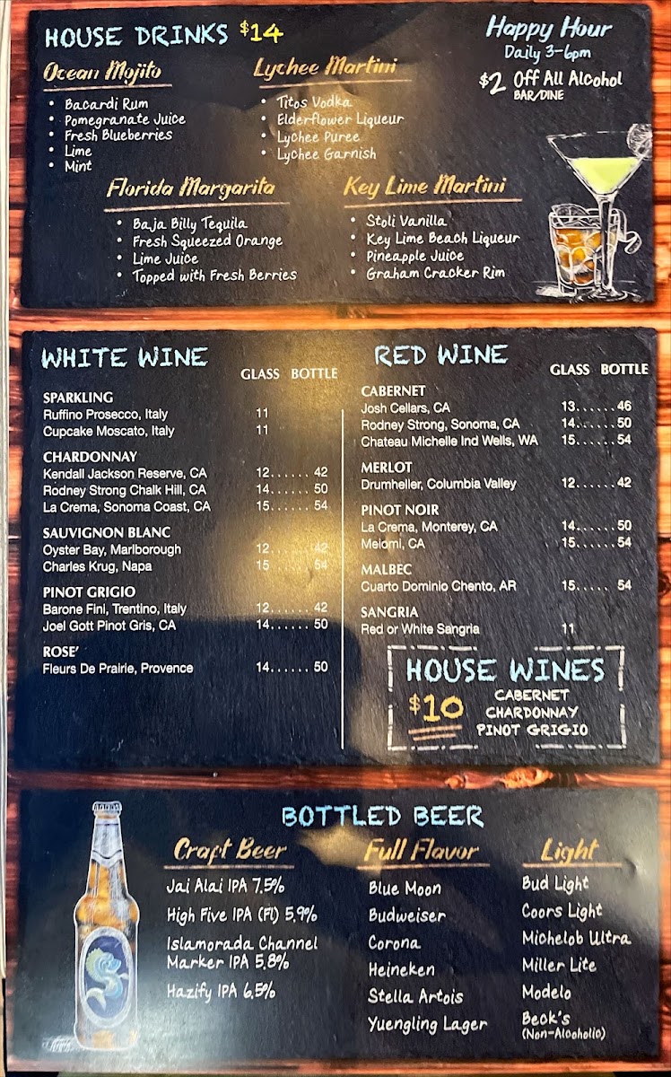 For desserts, the menu features choices such as Key Lime Pie and Carrot Cake. The beverage selection includes craft beers, such as Jai Alai IPA, and well-known full-flavor beer brands including Blue Moon, Budweiser, Corona, Heineken, Stella Artois, and Yuengling Lager.